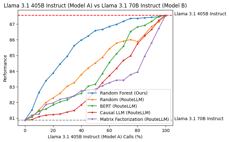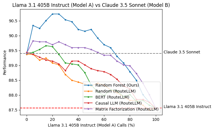 In Fig. 2, we compare RoRF to RouteLLM when routing between Claude 3.5 Sonnet and Llama 3.1 405B Instruct. We can see that when routing between these two strong models, the highest accuracy is achieved when a mixture of the two models is used, clearly showing how routing queries improves accuracy. It also shows that even for models that are similarly strong on average, there is significant disjointedness between the prompts one can respond to accurately versus the other. Moreover our router achieves its highest performance with a 12.5% cost reduction with respect to Claude 3.5 Sonnet.