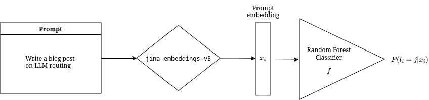 We let be the label assigned to prompt . The router predicts the probability of each label , where refers to the th dimension of the model output. In our routers, we use jinaai/jina-embeddings-v3 to embed the prompts () and we parameterize as a Random Forest Classifier, where the probabilities are computed empirically based on the proportion of the number of estimator outputs that predicted the label.
