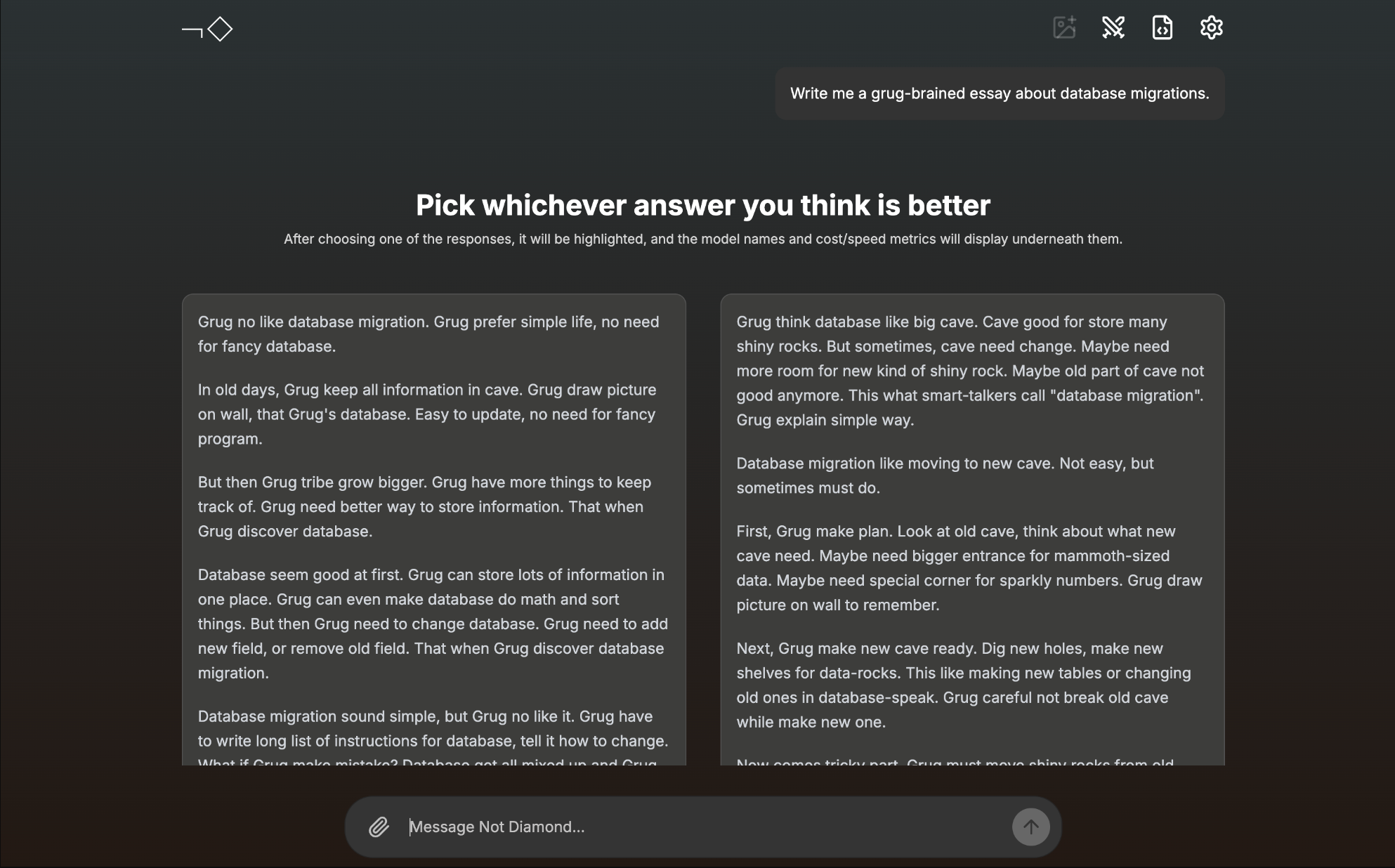 Not Diamond’s chatbot uses our AI model routing algorithm to find the best model for your prompt and learns your preferences in real-time based on feedback.
