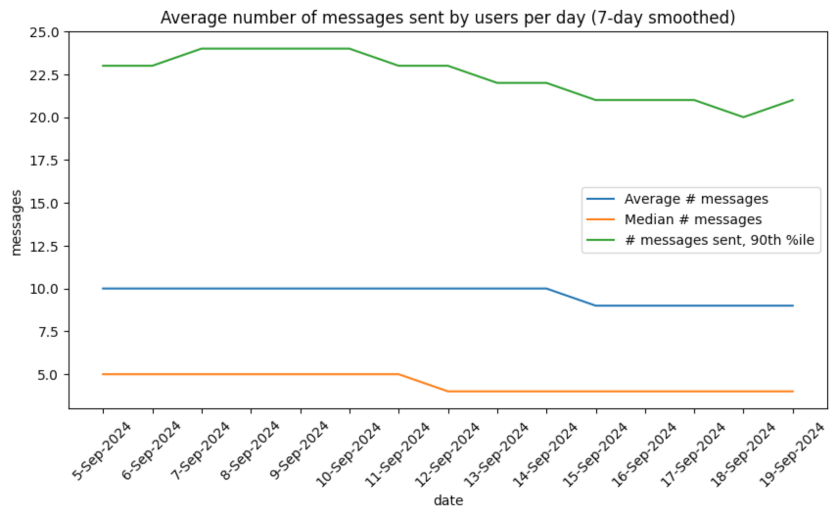 - the 90th %ile of users dropped from 23 messages / day to 21 messages / day