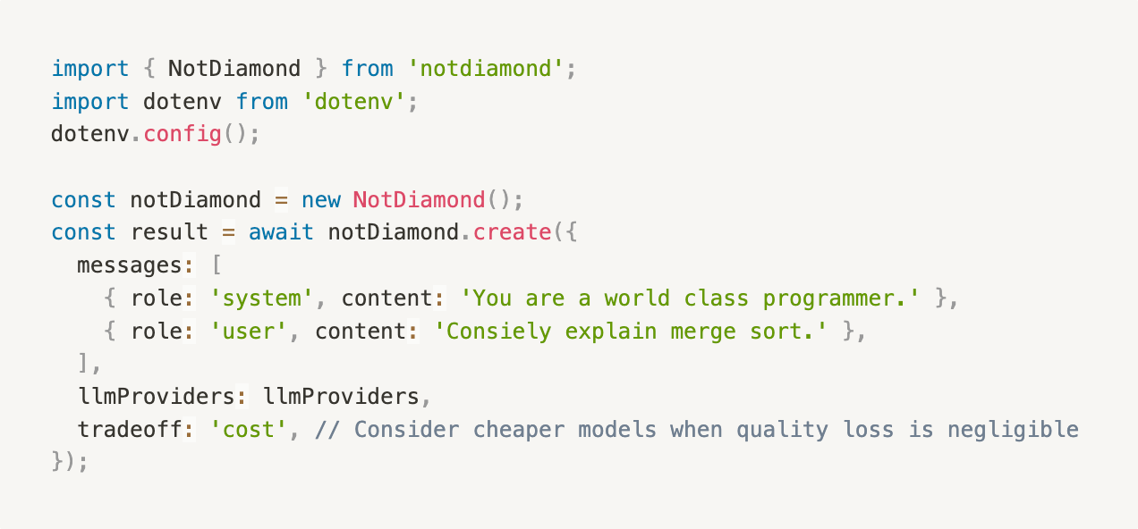 Not Diamond is explicitly designed to maximize response quality above all else by sending each query to the best-suited option from the set of LLMs defined by a developer. In addition though, our API also gives teams the ability to define explicit cost and latency tradeoffs. When requests include a cost tradeoff, our algorithm will evaluate whether the query can be fulfilled by a cheaper or faster model without degrading the quality of the response.